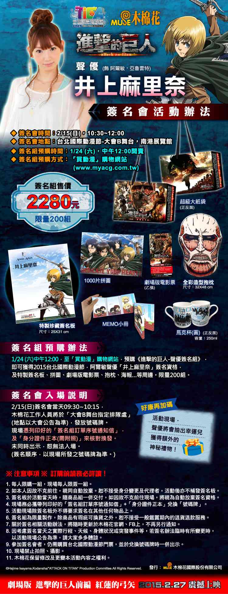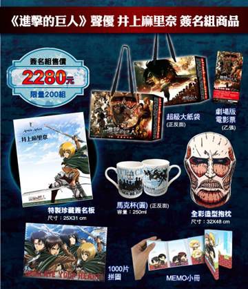 兼具偶像外貌、美聲實力的才女聲優「井上麻里奈」即將來台!為了宣傳即將上映的《進擊的巨人》劇場版【前編-紅蓮的弓矢】,「井上麻里奈」首度參加台北國際動漫節,將於2/15舉辦親簽見面會。簽名資格將於1/24(六)中午12:00於「買動漫」購物網站開賣,限額200名!不僅可近距離與美女聲優見面,又可獲得極具收藏價值的特製簽名板、要價將近千元的全彩造型抱枕、有著調查兵團主角們圖樣的1000片拼圖、實用性極高的馬克杯與MEMO小冊,還有劇場版前編電影票和限定紙袋,動畫代理商木棉花首次祭出最豐富的簽名商品組,不含簽名板,商品價值就已超過2000元,如此超值的撘配,足以證明木棉花的誠意,而首次來台舉辦簽名會的「井上麻里奈」也相當期待與粉絲見面,想近距離感受萌魅力的動漫迷們,務必要到現場支持!